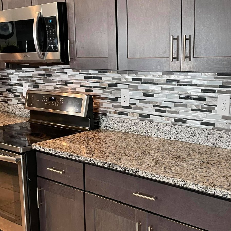 This time we were asked to install backsplash in stylish black and grey colors. Just look how much better kitchen looks after our job was finished!