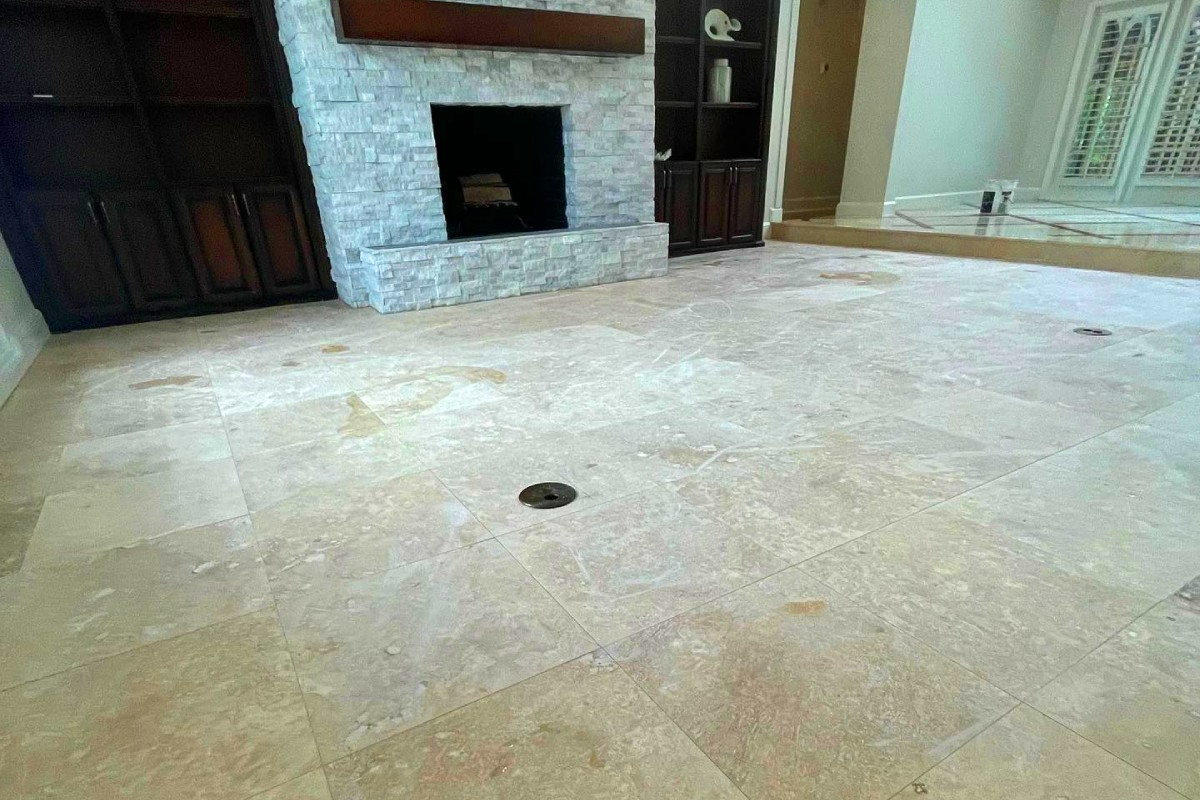 In this project, our client asked to change the flooring for the fireplace area. The customer chose Cleopatra marble tile for his floor.